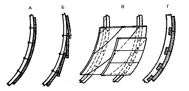 | Рис. Виды обшивки: А — вгладь; Б — кромка на кройку; В—диагональная; Г— на пазовых рейках |