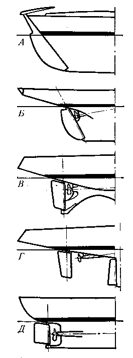 | Рис.. Основные типы постоянных рулей: А — подвешенный за транцем; Б— подвешенный к задней кромке плавника; В — отдельно стоящий с кронштейном; Г — блансирный; Д — руль моторно-парусной яхты |