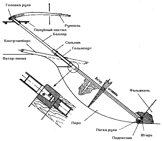 Руль подвешивается к ахтерштевню на петлях; нижняя часть баллера— пятка опирается на подпятник —основательную оковку, прикрепленную к ахтерштевню, дейдвуду или фальшкилю.
