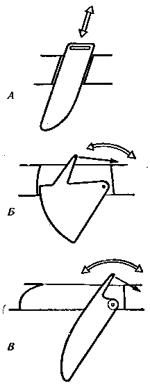 | Рис. Типы швертов: А — кинжальный; Б — качающийся секторный, В — качающийся мечевидный |
