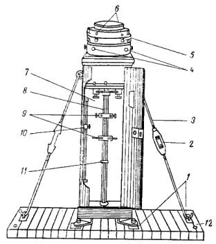 Рис, 12. Нактоуз: 1 — палубные планки; 2 — талреп; 3 —бакштаг; 4 — бруски мягкого железа; 5— шейка; 6 — клеммы пружинного подвеса; 7 — девиационный прибор; 8 — труба; 9 — гнезда для магнитов; 10 — ползун с барашком; 11 — кольцо, закрепляющее креповой магнит; 12 — подушка