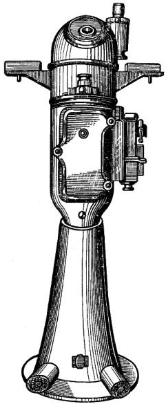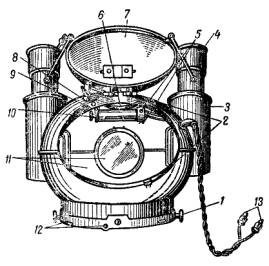 Котелок компаса КИ-11 (рис. 15) изготовлен из пластмассы и имеет две камеры, соединенные между собой специальным отверстием для переливания жидкости. Компасной жидкостью в данном случае является лигроин. Отсчет курса производится через выпуклое боковое стекло переднего отверстия котелка, которое одновременно является и увеличительным, по шкале конического обода. Курсовая черта смотрит в корму, поэтому при уклонении судна влево картушка пойдет как бы влево, а не вправо, как на обычном компасе. Котелок компаса не имеет специального амортизирующего подвеса, но его роль выполняет специальная пружина, надетая на колонку. Пружина при ударах сжимается и опускает колонку вниз, после чего мягко возвращает ее в прежнее положение. Этим предохраняются от повреждений топка и шпилька. Котелок имеет устройство для электроосвещения от бортовой сети 24 в. Кроме того, курсовая нить и деления картушки покрыты специальным светящимся составом, позволяющим снимать отсчет и держать заданный курс в темное время суток при отсутствии электроэнергии на судне. Деления картушки нанесены через 5°, причем цифры надписаны через 30° и обозначают десятки градусов. Котелок крепится на специальном щитке передней стенки рулевой рубки.