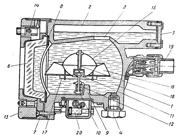 Рис 15. Котелок компаса КИ-11: 1 — основная катера, 2 — дополнительная камера, 3 — перепускное отверстие, 4 — отверстие для доливки и заливки жидкостей, 5—крышка дополнительной камеры, 6 —выпуклое стекло переднего отверстия котелка, 7 — прижимное стекло, 8 — пробковая прокладка, 9 — кронштейн, 10 — колонка, 11 — топка, 12 — амортизационная пружина, 13 — наружное кольцо, 14 — электрическая лампочка, 15 — поплавок; 16 — конический обод со шкалой, 17 —магнитные стрелки, 18 — стальная шпилька, 19 — вилка электроосвещения, 20 — девиационный прибор