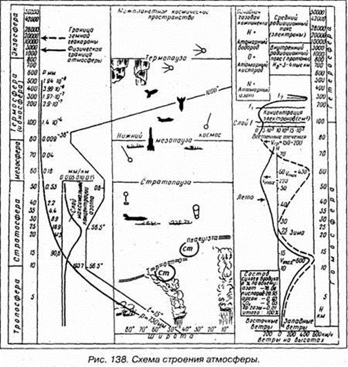 Для удобства изучения явлений, наблюдаемых в атмосфере, единого понимания, с учетом характера изменения температуры с высотой и особенностей теплового режима внутри каждого слоя, атмосферу делят на пять основных слоев (сфер) и четыре переходных слоя между ними. На рис. 138 представлена схема строения атмосферы.