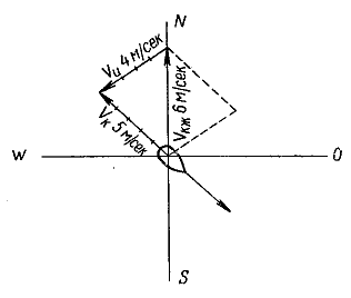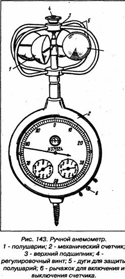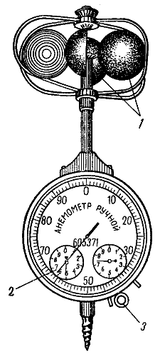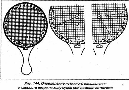 | Рис. 4. Анемометр ручной: 1 — полушария крестовины; 2 — отсчет 6560 мм; 3 — арретир | Рис. 5. Графический способ определения истинного ветра на движущемся судне |