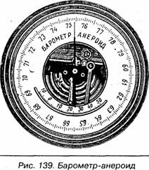 Атмосферное давление (давление воздуха, барометрическое давление) определяется весом столба воздуха, который давит на единицу площади горизонтальной поверхности. Давление с давних времен измерялось высотой ртутного столба в миллиметрах (дюймах). В двадцатых годах в практику введена новая единица измерения давления - миллибар (мб) - единица атмосферного давления, равная 1000 дин на 1 см 2. Дина (из физики) - сила, сообщающая массе в 1 г ускорение движения на 1 см в сек 2. Нормальное давление равно 1013,25 мб, стандартное - 1000 мб (750 мм). На судах встречаются приборы, измеряющие давление как в одних, так и в других единицах, поэтому для перевода одних в другие следует помнить, что 1 мб приблизительно равен 0,75 мм рт.ст., а 1 мм рт cm равен 1,3 мб. Для облегчения перевода существуют специальные таблицы, приведенные, для облегчения судоводителями поиска в приложении к настоящему пособию. Прибор для измерения атмосферного давления носит название барометра. По принципу действия различают жидкостный, анероид, гипсотермометр, газовый барометры. Основным прибором для измерения давления на судах является барометр-анероид, внешний вид которого приведен на рис. 139.