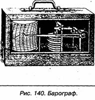 за изменениями давления в течение определенного промежутка времени и графической записи показаний служит барограф, который ав- томатически и непрерывно (в течение суток или недели - в зависимости от оборота барабана) ведет запись атмосферного давления. Общий вид барографа показан, на рис 140.