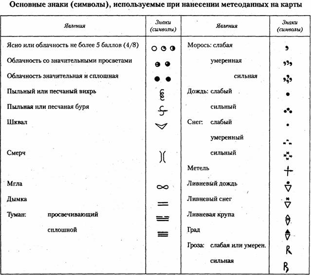 поэтому мы будем рассматривать этот вопрос в том объеме, который доступен судоводителю. В нашем случае задача составления прогноза погоды решается на основе анализа синоптических карт и карт барической топографии, устанавливающих фактическое состояние погоды. Прогноз обычно выдается в виде карт, на который отображается ожидаемое барическое поле у поверхности земли (воды) на 12,18,24,36,48 и 72, часа вперед от срока наблюдений, для которого составлена карта. Некоторые основные знаки (символы), используемые при нанесении метеорологических данных на карты, приведены в таблице на стр. 150. Ниже, также в таблице, приведены обозначения основных фронтов на картах погоды.