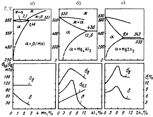 Свойства магния значительно улучшаются при легировании. Основными легирующими элементами магниевых сплавов являются Al, Zn, Mn, Li. Для дополнительного легирования используют Zr, Cd, Ce, Nd и др. Механические свойства магниевых сплавов при температуре 20–25 ° С улучшаются с помощью легирования алюминием, цинком (рис. 14.1) и цирконием, при повышенной температуре — добавкой церия, неодима и, особенно, тория. Цирконий и церий оказывают модифицирующее действие на структуру сплавов магния. Особенно эффективен цирконий: добавка 0,5–0,7 % Zr уменьшает размер зерна в 80–100 раз. Кроме того, Zr и Mn значительно уменьшают вредное влияние примесей железа и никеля на свойства сплавов.