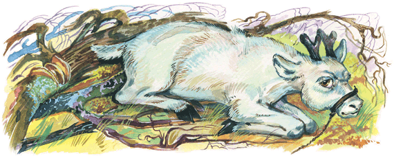 Каждый день мы пересчитывали пыжиков, но всё равно не уследили. Ночью белый пыжик отвязался от бревна и убежал за взрослыми оленями в тайгу, за грибами. Олени очень любят грибы. Медведи знают это и подкарауливают их ночью на тропах.