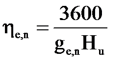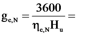 Принимаем значение эффективного КПД двигателя ηe,N = ___ из интервала 0,35…0,42 (дизель) или 0,25…0,32 (двигатели с искровым зажиганием) с учетом уровня его конструктивного совершенствования и условий реальной эксплуатации на предприятии, качества топлива и моторного масла, применения присадок и ревитализантов. Определяем расчетом при низшей теплоте сгорания топлива Нu =_____ МДж/кг (см.3.1) значения: