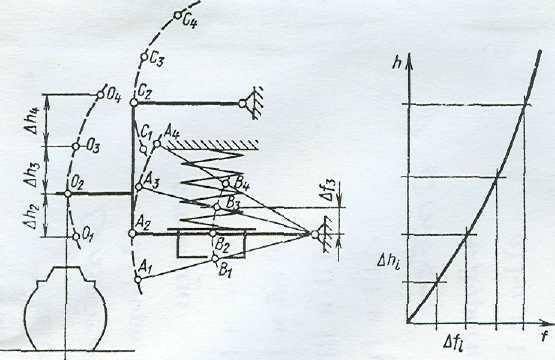 Желаемую упругую характеристику независимой подвески строят графоаналитическимспособом. Исходя из компоновки и анализа выполненных конструкций, задают кинематическую схему направляющего устройства (рисунок 6.14). В масштабе строят ряд положений рычагов со стойкой, указывают соответствующие им положения центров опорной площадки пружины (точки В1,В2, В3, B4) и колеса (точки О1,О2, О3, О4). Потом определяют вертикальные деформации пружины ∆fi и перемещения ∆hiколеса, соответствующие каждому положению рычагов и по этим данным строят график зависимости h = f (f) – кинематическую характеристику подвески.