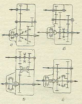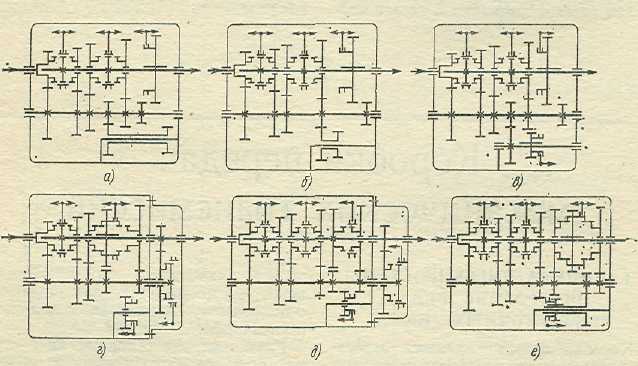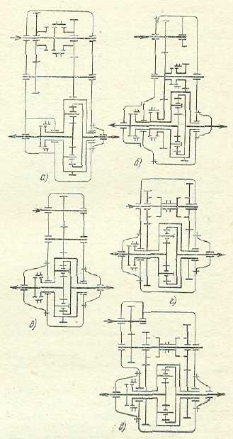 Рис. 9 Схемы комбинированных раздаточных коробок автомобилей: а – КрАЗ-255Б1; б – ЗИЛ-157КД; в – Magirys Deutz; г – Т-70; д – Berliet; е – Timken