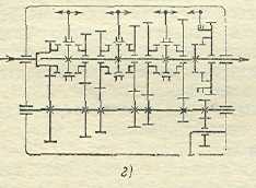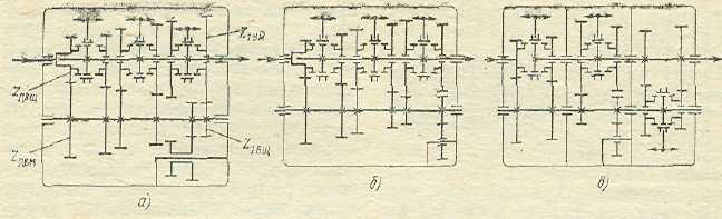 Рис. 8 Схемы раздаточных коробок с блокированными валами автомобилей: а – УАЗ -450; б – Таtra-111; в – Henschel