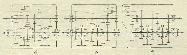 Рис. 7 Схемы раздаточных коробок с блокированным приводом и несоосными ведомыми валами автомобилей: а – ГАЗ-66, УАЗ -452; б – ЗИЛ-131; в – Austin Gipsy | Рис. 8 Схемы раздаточных коробок с блокированными валами автомобилей: а – УАЗ -450; б – Таtra-111; в – Henschel | |