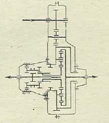 Рис. 9 Схемы комбинированных раздаточных коробок автомобилей: а – КрАЗ-255Б1; б – ЗИЛ-157КД; в – Magirys Deutz; г – Т-70; д – Berliet; е – Timken | Рис. 10 Схема раздаточной коробки с планетарным редуктором автомобиля Magirys D 15/D22 | |
