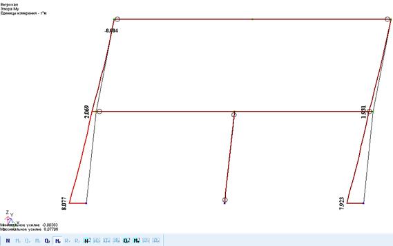В левом нижнем углу рабочей области показаны минимальное и максимальное значения усилий, а в левом верхнем углу – наименование эпюры и единицы измерения.
