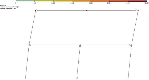 меню «Мозаика перемещений» (Деформации / В глобальной системе / Узловые перемещения / Мозаика перемещений по Х). В левом верхнем углу рабочей области показаны наименование мозаики и единицы измерения, а в верхней части – цветовая шкала перемещений. В результате на расчетной схеме узлы окрасились в цвета, в соответствии с перемещениями по цветовой шкале (рис. 5.4).