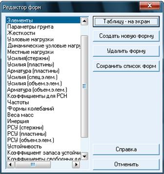 В диалоговом окне «Редактор форм» производится выбор нужной таблицы из списка. В данном примере интерес представляют следующие пункты: