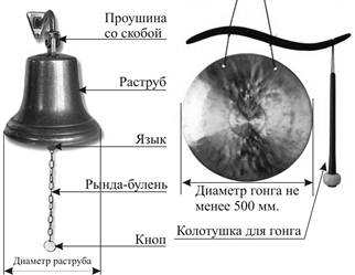 2. Конструкция. Колокол и гонг должны быть изготовлены из коррозионно-стойкого материала и издавать звук чистого тона. Диаметр раструба колокола должен быть: