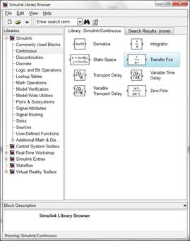 5. Перетащите блок TransferFcn (передаточная функция) из окна SimulinkLibraryBrowser (группа Continuous) в окно модели(рис.1.2.)