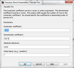 9. ЛКМ два раза нажмите на блок (напримерTransfer Fcn) и введите необходимые значения передаточной функции (рис.1.4). Данные значения необходимо рассчитать следующим образом: