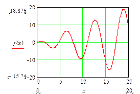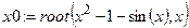 Решение уравнений. MathCad 2000 обладает несколькими способами приближённого решения уравнений. Простейший способ найти корень уравнения с одним неизвестным обеспечивает функция root. Например, необходимо найти корень трансцендентного уравнения