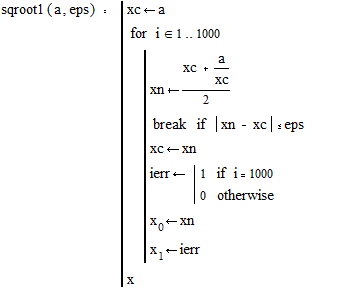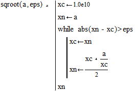 Пример 2.13. Составим программу-функцию, реализующую итерационную процедуру вычисления корня квадратного (см. пример 2.9) без зацикливания. Описание такой программы-функции имеет вид: