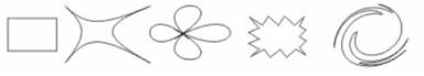 Рисунок 13 Примеры интерактивного искажения прямоугольника (прямоугольник, два его искажения выпячивания и выдавливания, искажение застежкой и искажение закручиванием)