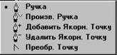 | Ручка–для создания и редактирования плавных криволинейных контуров. Эта кнопка имеет следующие альтернативные варианты: Произвольная ручка – позволяет вычерчивать произвольные дорожки, выполняя с помощью этого инструмента перетаскивание. Добавить Якорную Точку – щелчок этим инструментом на сегменте контура вставляет в него точку. Удалить Якорную точку – щелчок на точке контура удаляет ее, не разрывая контура. Преобразовать точку - меняет тип точек. Перетаскивание точки превращает ее из угла в дугу, щелчок – из дуги в угол. | ||||||