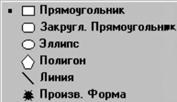 | -рисует прямоугольную фигуру. -рисует закругленный прямоугольник. -рисует эллипс. -рисует многоугольник. -рисует линию. -рисует произвольную фигуру. | ||||||