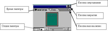 Палитры – это вспомогательные окна, предназначенные для выполнения различных операций над изображениями. По умолчанию палитры расположены на четырех панелях вертикально вдоль правого края.