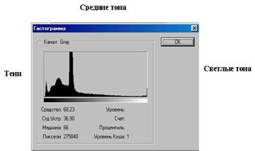 По горизонтальной оси располагаются значения яркостей: от 0 до 255, а по вертикальной – количество пикселей каждого уровня яркости. Тени – самая темная часть изображения с малым значением яркости. Светлые тона – самая светлая часть изображения с большим значением яркости. Между тенями и светлыми тонами находятся средние тона.