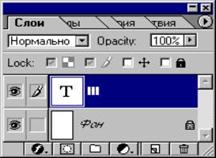 Введенный текст включается в изображение в виде нового слоя. Чтобы изменить его непрозрачность и режим наложения, воспользуйтесь палитрой Слои. Для применения к текстовому слою различных эффектов следует преобразовать текстовый слой в обычный с помощью команды Слои / Растеризовать / Тип.