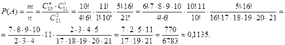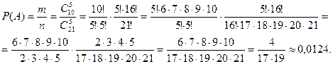 способами. Значит, вероятность того, что среди вытащенных пяти шаров ровно четыре белых, равна: