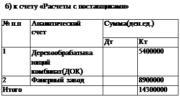| I | Платежное требование № 745 лесопильного завода и приходные ордера №115-117 Поступили на склад фабрики: •доски хвойные 80 м3 по,60 т. р. за 1м3 •доски лиственные 20 м3 3по 70 т.р. за 1 м3 | 4800000 1400000 | |