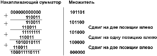Во многих компьютерах умножение производится как последовательность сложений и сдвигов. Для этого в АЛУ имеется регистр, называемый накапливающим сумматором, который до начала выполнения операции содержит число ноль. В процессе выполнения операции в нем поочередно размещаются множимое и результаты промежуточных сложений, а по завершении операции — окончательный результат.