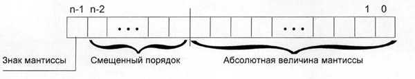 Здесь порядок n -разрядного нормализованного числа задается в так называемой смещенной форме: если для задания порядка выделено k разрядов, то к истинному значению порядка, представленного в дополнительном коде, прибавляют смещение, равное (2k-1 — 1). Например, порядок, принимающий значения в диапазоне от —128 до +127, представляется смещенным порядком, значения которого меняются от 0 до 255.