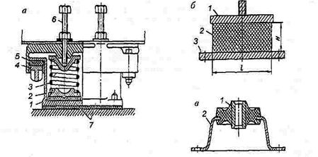 Зазвичай, основною частиною ізолятора (рис. 2.15, а) є пружина 3, що спирається на гумову прокладку 1. Пружину i прокладку розміщено у металевому стакані 2. Для запобігання ударам з дуже великою амплітудою коливань передбачено обмежувачі 4 i 5. Гумове кільце 4 зaпoбiгaє також ударам металу об метал у разі бокових вібрацій. Опорну конструкцію 7 використовують для кріплення віброізолятора до основи. Кріплення установки, що ізолюється, до ізолятора здійснюють за допомогою болта 6. Пружина 3 слугує для ізоляції від коливань низьких частот, а гумова прокладка 1 – для ізоляції від коливань високих частот.