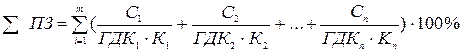 Показник гранично допустимого забруднення атмосферного повітря – відносний інтегральний критерій оцінки забруднення атмосферного повітря населених місць, який характеризує інтенсивність та характер сумісної дії всієї сукупності присутніх у ньому шкідливих домішок. ГДЗ розраховується для кожного випадку на основі визначених експериментально та затверджених у встановленому порядку коефіцієнтів комбінованої дії (Ккд). Ккд відображає характер сумісної біологічної дії одночасно присутніх в атмосферному повітрі ЗР (сумація, посилення, послаблення або незалежна дія). Його цифрове значення встановлюється експериментальним (або розрахунковим) шляхом та виражається в долях від індивідуальних ГДК ЗР (додаток А). ГДЗ розраховуєтьсяза формулою (1.15):