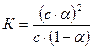 Если обозначить концентрацию электролита, распадающегося на два иона, через с, а степень его диссоциации в данном растворе через α, то концентрация каждого из ионов будет с∙α, а концентрация недиссоциированных молекул с∙(1 - α). Тогда уравнение константы диссоциации принимает вид
