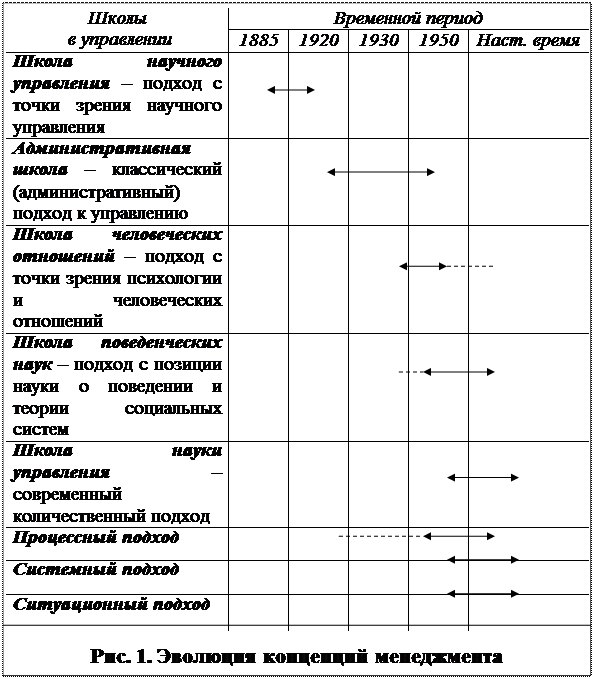 Формирование менеджмента как науки проходило на протяжении многих лет. Свой вклад в его развитие внесли ученые и практики, относящиеся к различным научным школам менеджмента. Основные этапы формирования научной концепции менеджмента в первой половине XX в. отражены на рис. 1.
