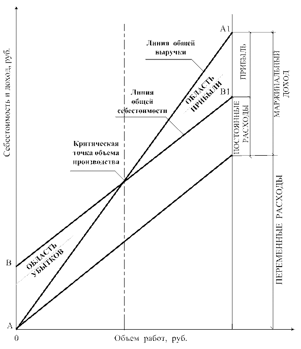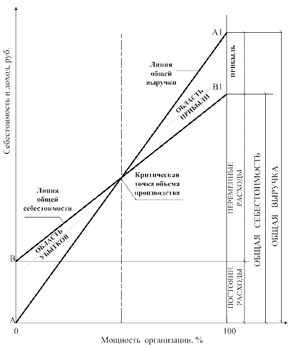 Себестоимость откладывается с подразделением на постоянную и переменную части. Линия В — В1 на графике отражает общую себестоимость для соответствующих процентов использования мощности. Линия А — А1 — это линия выручки от реализации продукции. Точка пересечения линий общей выручки и общей себестоимости представляет собой точку критического объема производства. На графике видно, что при объеме производства ниже этой точки строительная организация своей выручкой не может покрыть свои затраты, следовательно, терпит убытки. Наоборот, при объеме производства большем, чем критический, предприятие получает прибыль.