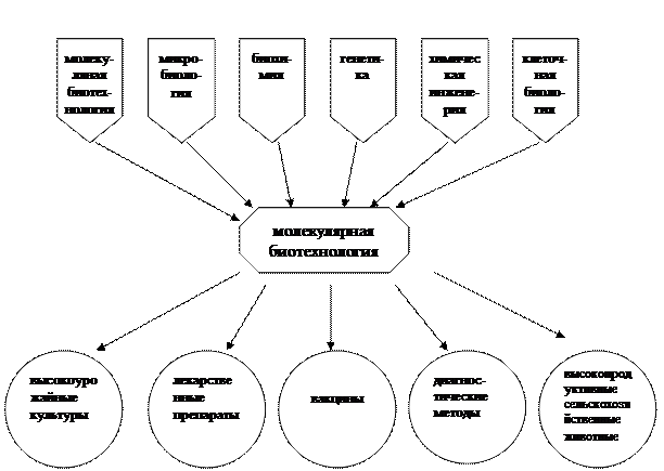 В широком смысле молекулярная биотехнология пользуется достижениями самых разных областей науки и применяет их для создания самых разных коммерческих продуктов (рис.1)