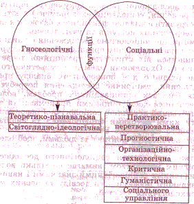 Будь-яка гуманітарна наука виконує специфічні й універсальні функції, які можна об'єднати у дві групи — пізнавальну (гносеологічну) та соціальну. Завдяки реалізації пізнавальних функцій стають доступнішими відомості про певні сторони життя соціальних об'єктів, їх властивості, відносини, а соціальна функція дає змогу оптимізувати процеси, відносини, зв'язки.