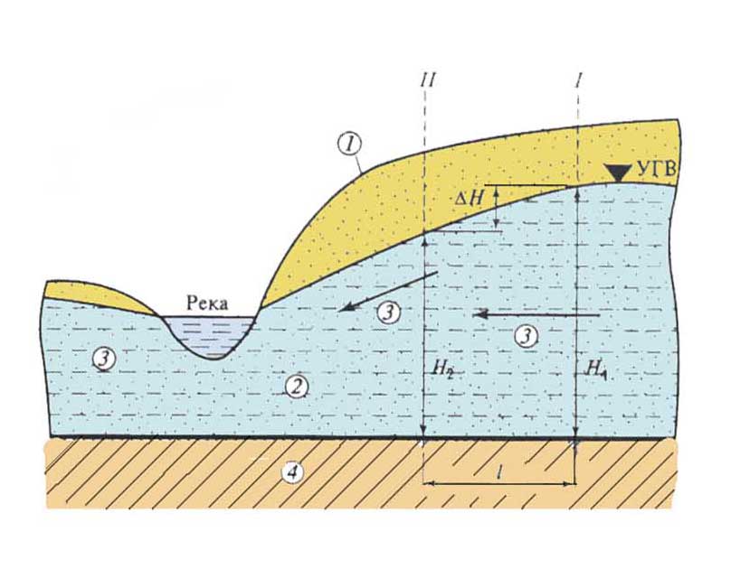 1 – поверхность земли, 2 – водовмещающая порода (песок), 3 – направление грунтового потока, 4 – водоупор, I и II – ось скважин № 1 и № 2 соответственно, Н1 и Н2 - величины напоров, ∆Н – падение напора, l – расстояние между скважинами.