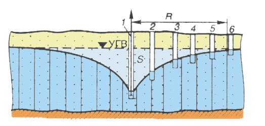 1 – точка откачки, 2–6 – наблюдательные скважины, УГВ – уровень грунтовых вод до откачки, S – понижение уровня воды в 1 скважине, R – радиус воронки (влияния).