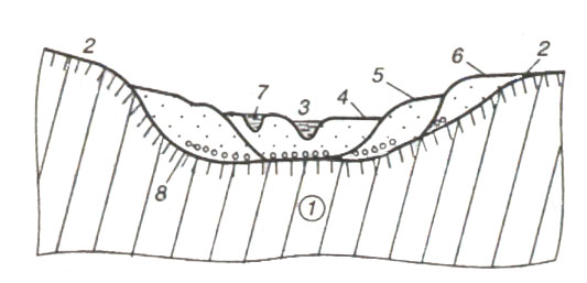 6 – вторая надпойменная терраса, 7 – старица, 8 – дно.