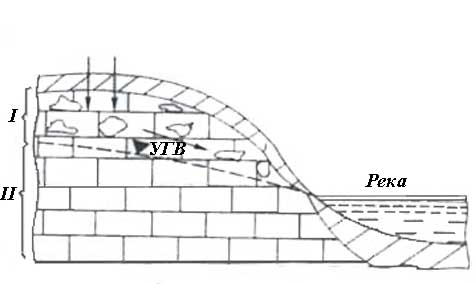 I – зона развития карста; II – зона цементации; УГВ – уровень грунтовых вод