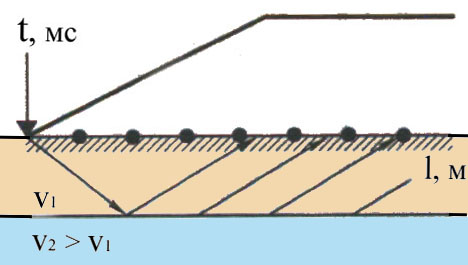 Сейсморазведка – метод исследований, основанный на измерении скорости прохождения продольных волн по глубине (V2>V1).